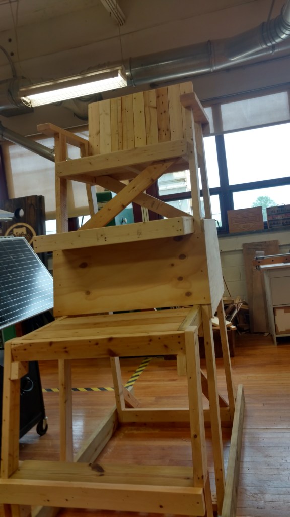 Another project I was happily roped into during my senior year as part of my time as a Teacher’s Assistant was this lifeguard chair shown here. The reason why we made this was because the PTA wanted it for After-Prom (due to their theme of choice). Because of when they asked us, once we decided on a design, myself and my wood shop teacher had only 3 days to construct and paint it. The design we found that we believed would work originally had the height of the seat being 6 feet off the ground. We wanted to make it more interesting than a measly 6 feet, so we raised the height all the way to 11 feet. The issues we did not initially consider were how to get up to a seat 11 feet in the air since the design did not anticipate that alteration, as well as the extreme instability that now arose from it being so high. So, once we constructed the lifeguard stand, we added two of our own custom-made steps/seats, and increased the overall stability of the chair in all directions with rails and angled pieces.