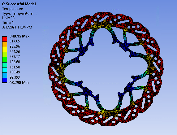 What I was able to complete during this season of being a brake subteam lead was the beginnings of a better simulation for the brake rotors. In past seasons, the ANSYS simulations did not include any convection from the air or radiation from nearby sources. Since we had determined this was a part of the design process that was weakest (and I believed I could make changes to impact it) I started on a proper simulation. An image of my improved simulation is below, as well as the actual rotors in-situ and the pedalbox that held the adjustable pedals (which also fell partly into my subsystem).